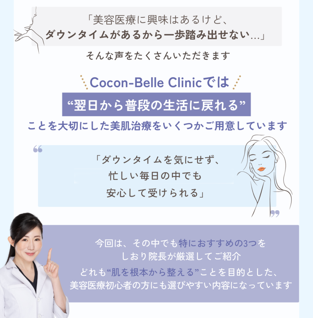 「肌質を根本から整えたい」「ダウンタイムや痛みはできるだけ避けたい」そんな声に応えるべく、しおり院長が厳選した“肌を育てる”ための施術を3つご紹介します。いずれもココンベルクリニックならではの視点で選ばれた穏やかな肌管理メニューです。